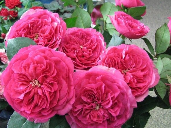 Флорибунда из серии ностальгических роз, с густомахровыми розетковидными цветками яркого фуксиевого цвета.