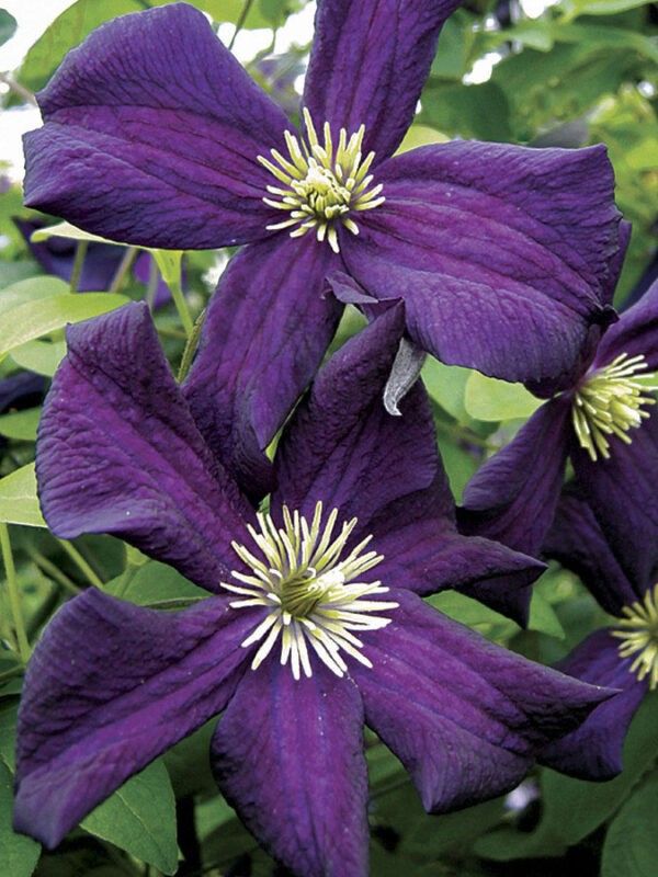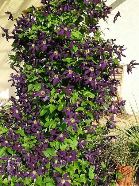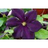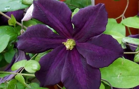 Клематис 'Романтика' - эстонский сорт с бархатистыми, темно-фиолетовыми, почти черными цветками диаметром 8-12 см и светло-желтыми тычинками, цветет обильно на побегах текущего года в июле-сентябре, идеален для вертикального озеленения на светлом фоне или в контрасте с яркими растениями, хорошо растет на опорах и в контейнерах.