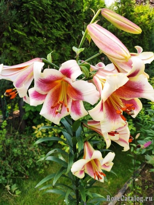 Эта лилия недаром названа Passion Moon, что в переводе означает «Страстная луна». У нее очень крупные и в тоже время нежные цветки, в которых сочетаются кремовые и винно-бордовые цвета, с желтым переливом. Соцветия состоят из 8-10 бутонов, из них обычно одновременно открыто 4-5. Всю свою красоту и силу эта лилия показывает в 3-4 летнем возрасте.