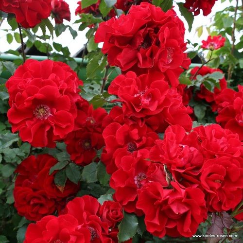Отличная роза! Высокая, мощная, абсолютно здоровая с темной листвой, цветы собраны в большие соцветия-шапки, ярко-красные, издалека прям светятся, не выгорает на солнце! Цветок держит долго.
