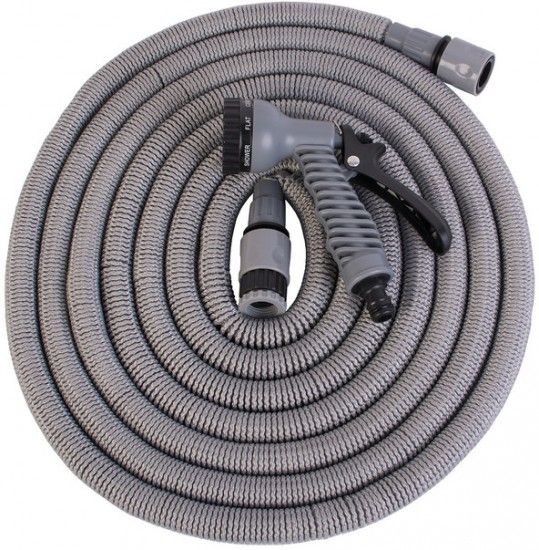 Растягивающийся шланг 1" с поливочным 7-режимным пистолетом, пластиковым коннектором и адаптером на 1/2"-3", длина шланга 15м.